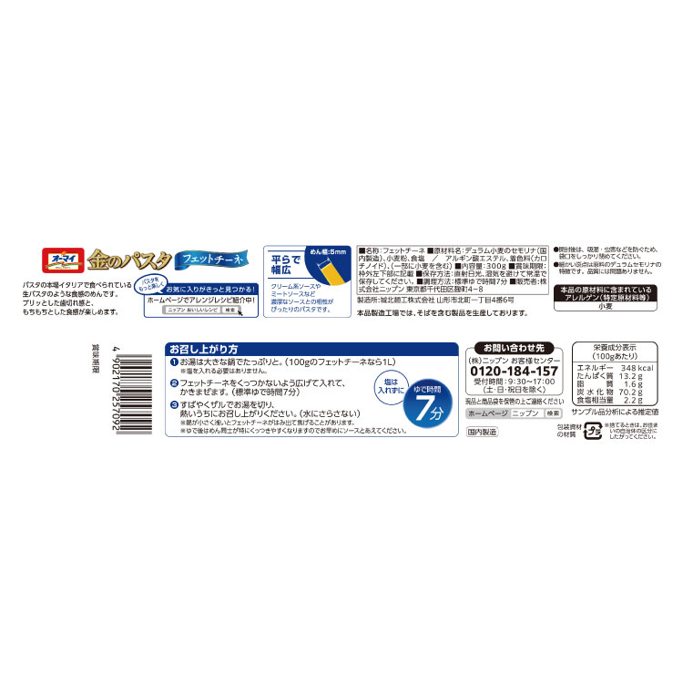 | 原材料名 | デュラム小麦のセモリナ(国内製造)、小麦粉、食塩 / アルギン酸エステル、着色料(カロチノイド)、(一部に小麦を含む) |