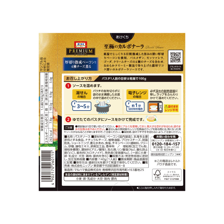 | 原材料名 | ベーコン(国内製造)、乳等を主要原料とする食品、ナチュラルチーズ、植物油脂、プロセスチーズ、脱脂粉乳、ショートニング、還元水あめ、食塩、チキンペースト調味料、クリーム、砂糖、酵母エキス、卵黄加工品、香辛料 / 増粘剤(加工でん粉、増粘多糖類)、調味料(アミノ酸等)、乳化剤、リン酸塩(Na)、酸化防止剤(V.C)、着色料(カロチノイド)、発色剤(亜硝酸Na)、(一部に小麦・卵・乳成分・大豆・鶏肉・豚肉を含む) |