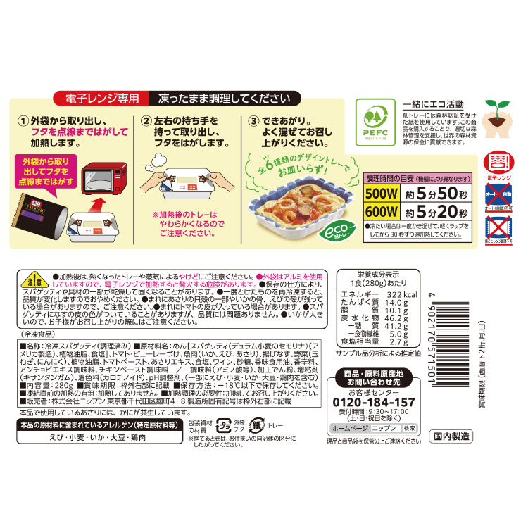 | 原材料名 | めん[スパゲッティ(デュラム小麦のセモリナ)(アメリカ製造)、植物油脂、食塩]、トマト・ピューレーづけ、魚肉(いか、えび、あさり)、揚げなす、野菜(玉ねぎ、にんにく)、植物油脂、トマトペースト、あさりエキス、食塩、ワイン、砂糖、香味食用油、香辛料、アンチョビエキス調味料、チキンペースト調味料 / 調味料(アミノ酸等)、加工でん粉、増粘剤(キサンタンガム)、着色料(カロチノイド)、pH調整剤、(一部にえび・小麦・いか・大豆・鶏肉を含む) |