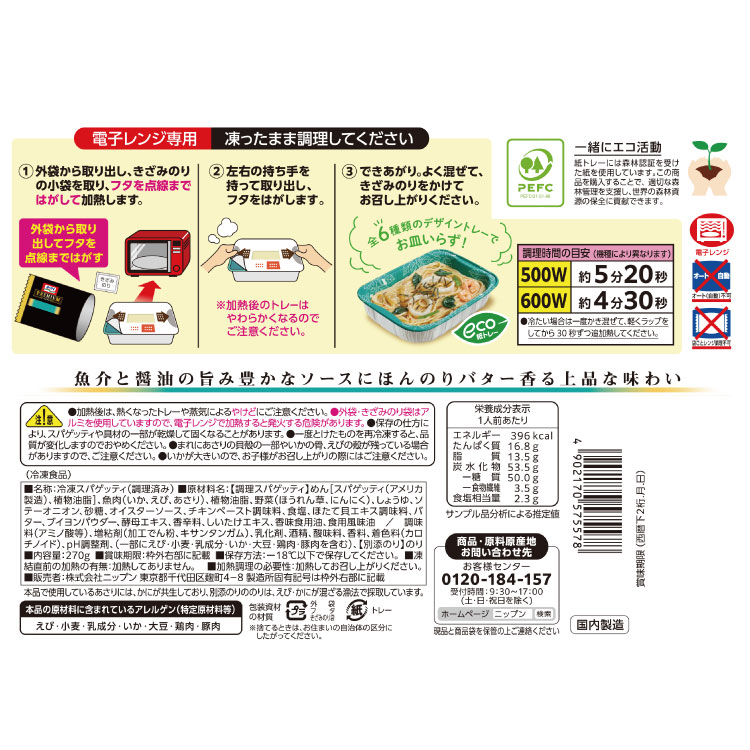 | 原材料名 | 【調理スパゲッティ】めん[スパゲッティ(アメリカ製造)、植物油脂]、魚肉(いか、えび、あさり)、植物油脂、野菜(ほうれん草、にんにく)、しょうゆ、ソテーオニオン、砂糖、オイスターソース、チキンペースト調味料、食塩、ほたて貝エキス調味料、バター、ブイヨンパウダー、酵母エキス、香辛料、しいたけエキス、香味食用油、食用風味油 / 調味料(アミノ酸等)、増粘剤(加工でん粉、キサンタンガム)、乳化剤、酒精、酸味料、香料、着色料(カロチノイド)、pH調整剤、(一部にえび・小麦・乳成分・いか・大豆・鶏肉・豚肉を含む)、【別添のり】のり |