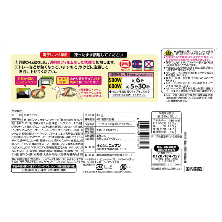 | 原材料名 | 精白米(国産)、ハンバーグ【食肉(鶏肉、豚肉、牛肉)、玉ねぎ、パン粉、粒状大豆たん白、牛脂、ビーフオイル、その他】、グリルチキン(鶏肉、グルコース、その他)、野菜(ブロッコリー、玉ねぎ、ピーマン、にんにく)、トマト・ピューレーづけ、フライドポテト、押麦、カレールウ、植物油脂、トマトペースト、ソテーオニオン、乳等を主要原料とする食品、ブイヨンパウダー、ビーフエキス調味料、砂糖、ナチュラルチーズ、香辛料、カレー粉、乾燥マッシュポテトパウダー、食塩、しょうゆ、ショートニング、酵母エキス / 調味料(アミノ酸等)、着色料(カラメル、カロチノイド、カカオ)、増粘剤(加工でん粉、キサンタンガム)、キシロース、乳化剤、炭酸水素Na、炭酸Na、リン酸塩(Na)、クエン酸、香料、(一部に小麦・卵・乳成分・牛肉・大豆・鶏肉・豚肉を含む) |