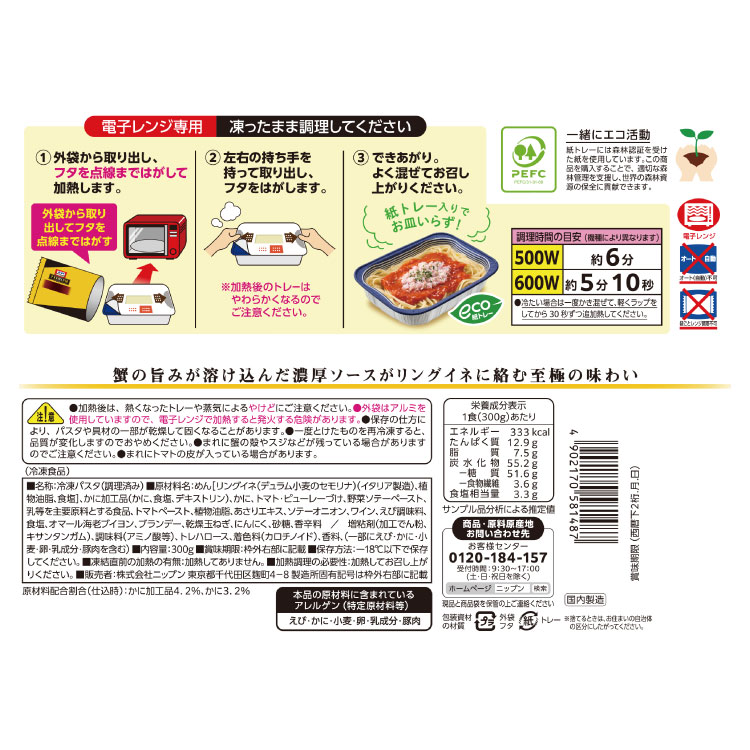 | 原材料名 | めん[リングイネ(デュラム小麦のセモリナ)(イタリア製造)、植物油脂、食塩]、かに加工品(かに、食塩、デキストリン)、かに、トマト・ピューレーづけ、野菜ソテーペースト、乳等を主要原料とする食品、トマトペースト、植物油脂、あさりエキス、ソテーオニオン、ワイン、えび調味料、食塩、オマール海老ブイヨン、ブランデー、乾燥玉ねぎ、にんにく、砂糖、香辛料 / 増粘剤(加工でん粉、キサンタンガム)、調味料(アミノ酸等)、トレハロース、着色料(カロチノイド)、香料、(一部にえび・かに・小麦・卵・乳成分・豚肉を含む) |