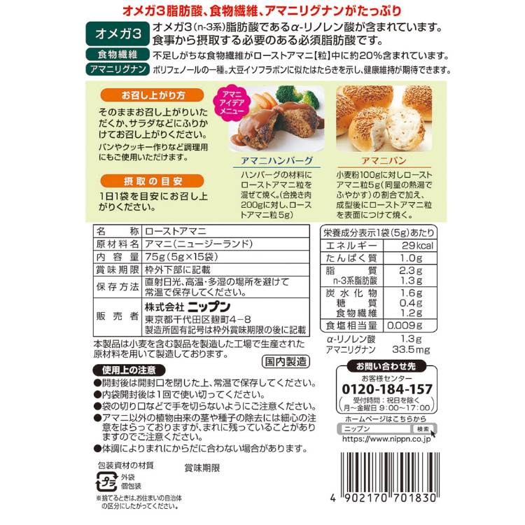 ニップンのローストアマ二粒はニュージーランド産のアマニを使用しています。