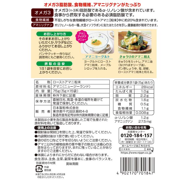 | 使用上の注意 | ・開封後は開封口を閉じた上、常温で保存してください。 ・内袋開封後は1回で使い切ってください。 ・袋の切り口などで手を切らないようにご注意ください。 ・アマニ以外の植物由来の茎や種子の除去には細心の注意をはらっておりますが、まれに残っていることがありますのでご注意ください。 ・体調によりまれにからだに合わない場合があります。 |