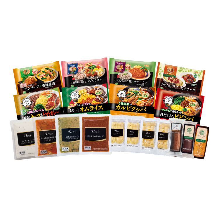 nestのパスタ、冷凍プレート、スイーツを詰め合わせた、お得で楽しさいっぱいのセットです。
