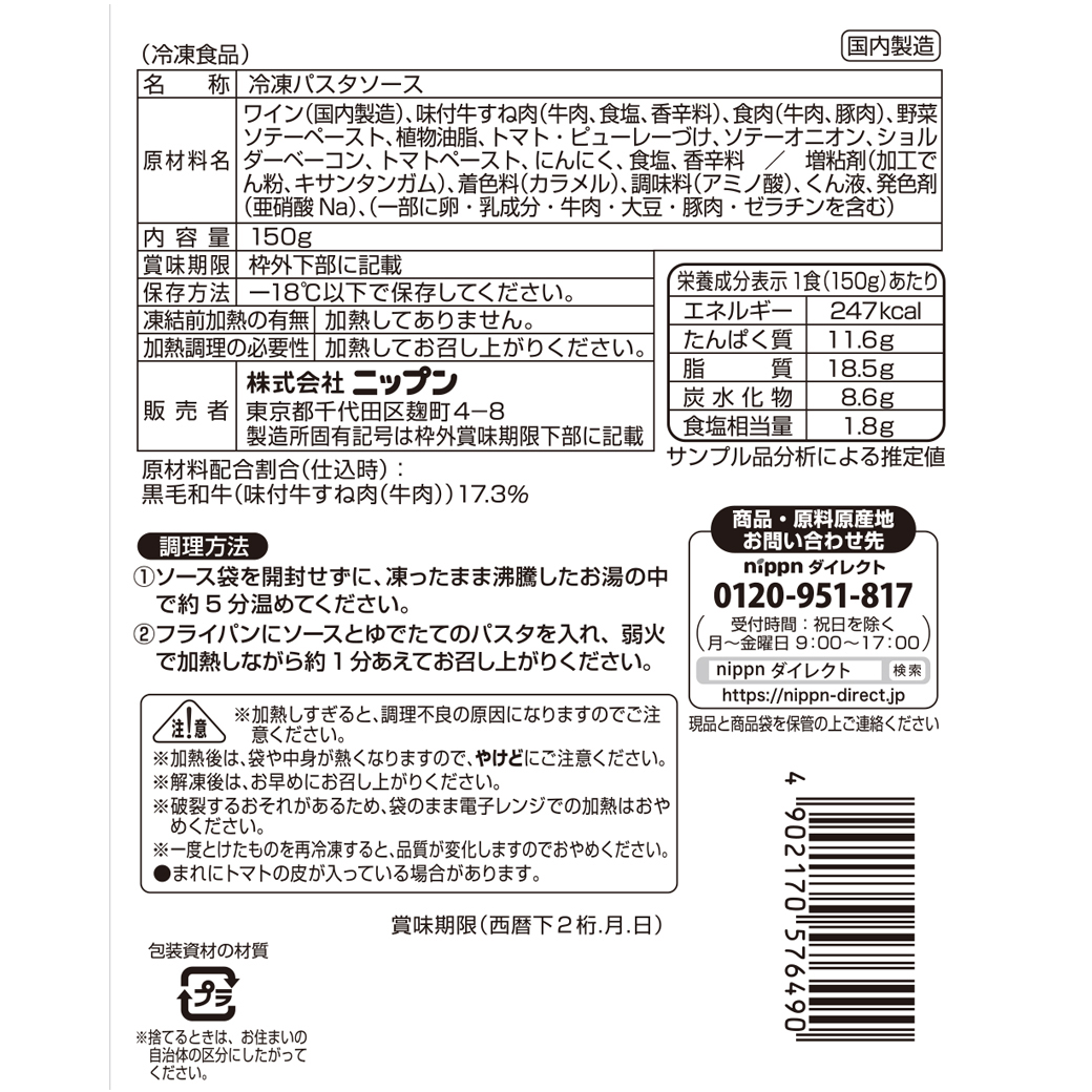 原材料名・重量等 | 【黒毛和牛のボロネーゼ】 ワイン(国内製造)、味付牛すね肉(牛肉、食塩、香辛料)、食肉(牛肉、豚肉)、野菜ソテーペースト、植物油脂、トマト・ピューレーづけ、ソテーオニオン、ショルダーベーコン、トマトペースト、にんにく、食塩、香辛料 / 増粘剤(加工でん粉、キサンタンガム)、着色料(カラメル)、調味料(アミノ酸)、くん液、発色剤(亜硝酸 Na)、(一部に卵・乳成分・牛肉・大豆・豚肉・ゼラチンを含む) 内容量:150g 【国産青じそのトラパネーゼ】 セミドライトマト(トルコ製造)、イタヤ貝、トマト・ピューレーづけ、植物油脂、野菜(いんげん、青じそ、にんにく)、アーモンドペースト、あさりエキス、ローストアーモンド、トマトペースト、食塩、酵母エキス / 乳化剤、増粘剤(キサンタンガム)、(一部にアーモンドを含む) 内容量:130g |