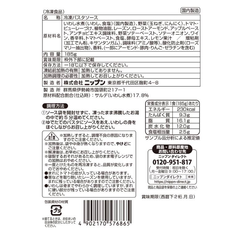 | 原材料名 | いわし水煮(いわし、食塩)(国内製造)、野菜(玉ねぎ、にんにく)、トマト・ピューレーづけ、植物油脂、レーズン、ローストアーモンド、アップルペースト、アンチョビエキス調味料、野菜ソテーペースト、ソテーオニオン、ワイン、香辛料、トマトペースト、食塩、酵母エキス、レモン果汁 / 増粘剤(加工でん粉、キサンタンガム)、調味料(アミノ酸等)、酸化防止剤(ローズマリー抽出物)、香料、(一部にアーモンド・豚肉・りんご・ゼラチンを含む) |